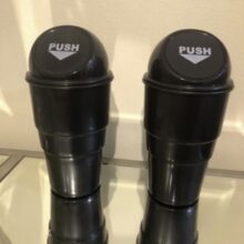 Made from non-toxic ABS plastic, our little trash bin mimics the look of large, full-sized trash cans, with a “PUSH” logo at the lid opening. The can fits right into a standard-sized cup holder for a trash bin for snack wrappers right within your reach. The can measures 7.9 x 2.7 inches (L x W).